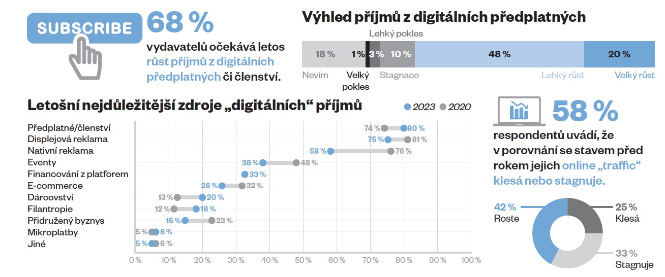 Ze studie, v rámci níž byli osloveni 303 vedoucí pracovníci (šéfredaktoři, výkonní a generální ředitelé a vedoucí digitálních a inovačních oddělení mediálních domů, ať již tradičních či nově vzniklých) z 53 zemí, vyplynulo, že téměř čtyři z deseti (37 %) dotázaných cítí co do ekonomických vyhlídek pro letošní rok nejistotu. O něco více vydavatelů (44 %) se cítí sice sebevědoměji, ale i ti přiznávají rostoucí náklady a potíže s udržením předplatitelů a příjmů z reklamy.