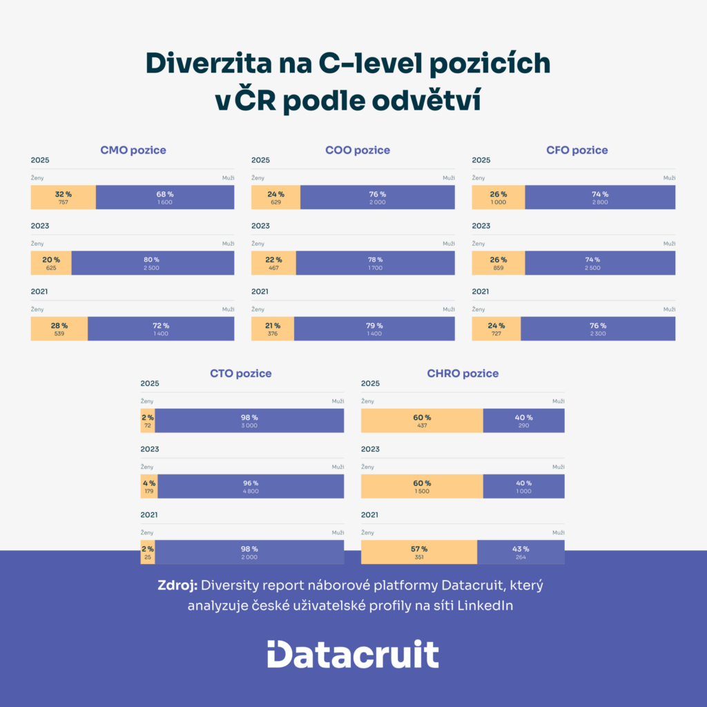 Na úrovni C-suite pozic dominují ženy aktuálně s 60procentní většinou ve vedoucích pozicích v oblasti řízení lidských zdrojů. Muži naopak převažují ve všech ostatních sledovaných oblastech, nejvýrazněji pak na pozicích CTO (98 procent), COO (76 procent) a CFO (74 procent).