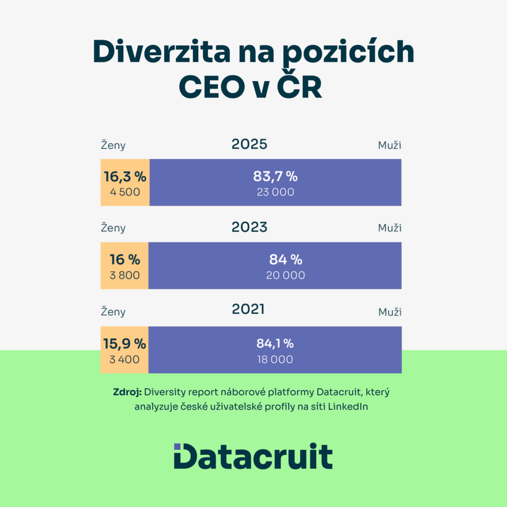 Převážně mužskou doménou bez výrazné změny ve sledovaném období zůstává v České republice nadále role CEO. V roce 2025 zastávaly ženy v porovnání s muži zhruba 16 procent těchto pozic, což je velmi podobný podíl, jaký byl zaznamenán o čtyři roky dříve. Naprostá většina žen i mužů na této úrovni (cca 70 procent) má více než desetiletou praxi a přes 35 procent žen a téměř 40 procent mužů si udržuje svou nynější pozici v nejvyšším vedení firem více než 10 let.