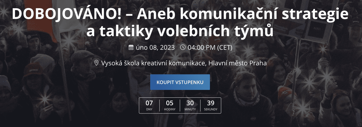 Rozebrat komunikační strategie a taktiky volebních týmů přijdou ve středu 8. února od 16 hodin do posluchárny Vysoké školy kreativní komunikace v Praze čtyři odborníci na strategii i digitál.