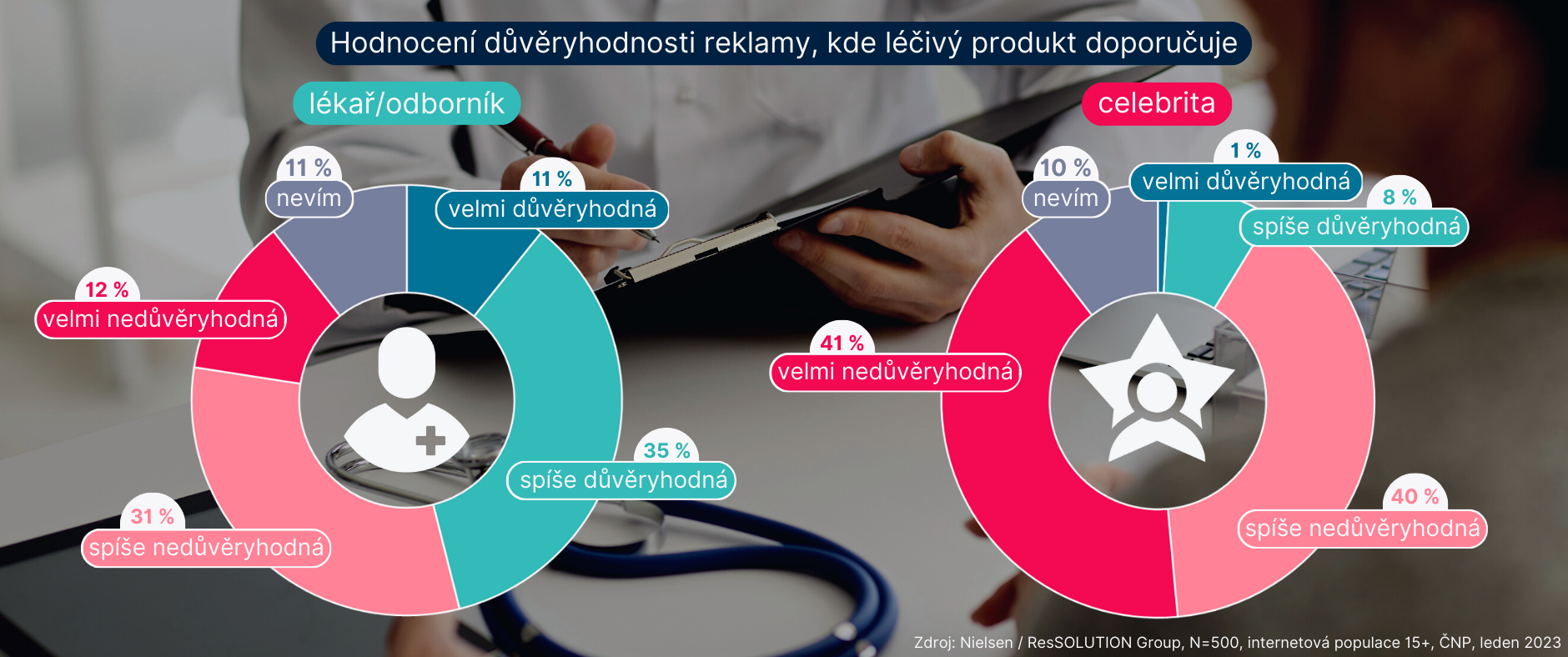 Výzkum Nielsen a ResSolution Group se dále věnoval důvěryhodnosti reklamy, ve které léčivý produkt doporučuje lékař či odborník. Zde se respondenti neshodli: takové reklamě totiž důvěřuje zhruba stejný podíl respondentů (46 %) jako naopak (43 %). „Zajedno“ jsou však v případě posuzování důvěryhodnosti reklamy, kde daný produkt doporučuje celebrita či známá osobnost – pro 8 z 10 dotázaných je taková komunikace nevěrohodná.
