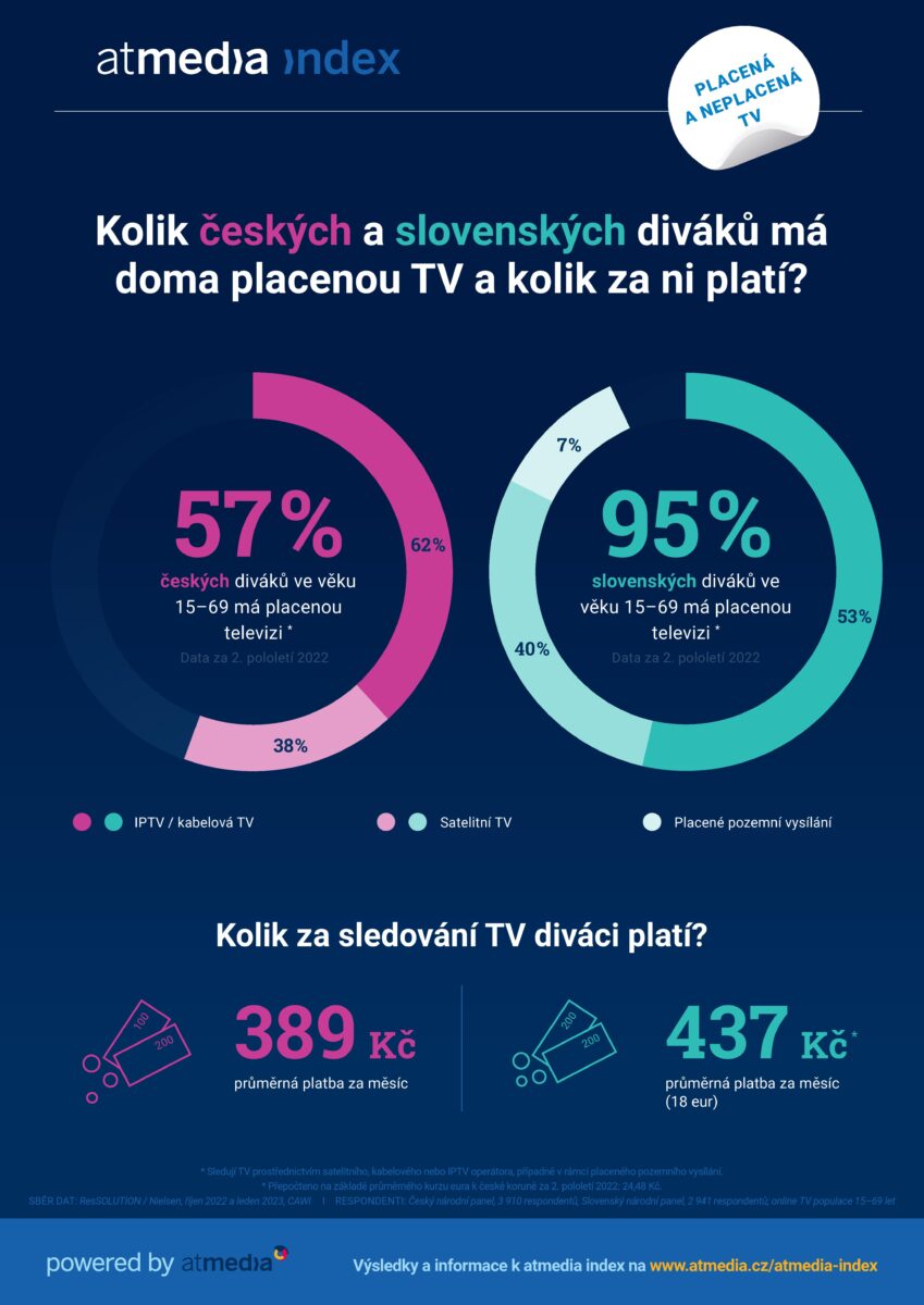 Výzkum atmedia index také ukázal, že slovenští diváci platí za služby některého z operátorů placené televize o téměř 50 Kč měsíčně více než čeští. Ve druhém pololetí loňského roku to bylo konkrétně v průměru 18 eur měsíčně, v přepočtu 437 Kč. Čeští diváci ve stejném období vydali za placenou televizi v průměru 389 Kč měsíčně. „To je obdobná částka jako v prvním pololetí loňského roku, k žádnému zásadnímu zdražení nedošlo. Zajímavé bude sledovat, jak se budou průměrné měsíční výdaje za placenou televizi vyvíjet v letošním roce. Z důvodu vysoké míry inflace se nabízí otázka, zda budou operátoři placené televize své služby zdražovat a případně o kolik,“ uvádí Pavel Müller.