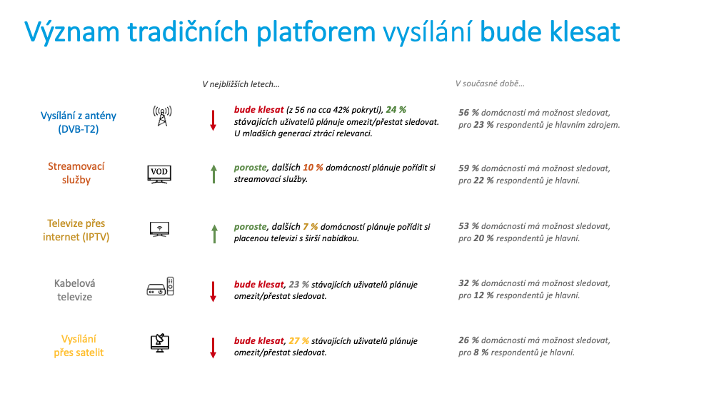 Výzkumníci se lidí ptali i na to, jak do budoucna plánují přijímat videoobsah. Méně či vůbec plánují lidé sledovat vysílání z klasické antény (24 % stávajících diváků přes terestriku), přes satelit (27 %) či kabelovou televizi (23 %).
