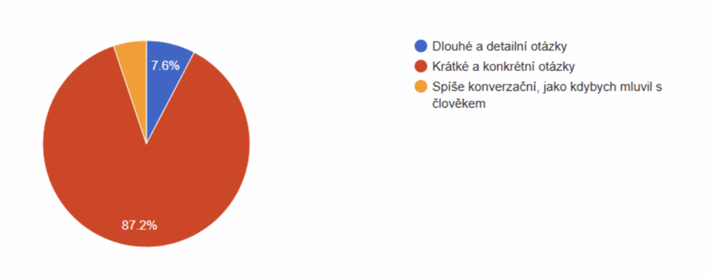 Uživatelé používající klasické internetové vyhledávače (Google, Seznam a další) zadávají nejčastěji krátké dotazy, 87 procent uživatelů. Jen 7,6 procenta používá dlouhé a detailní otázky.