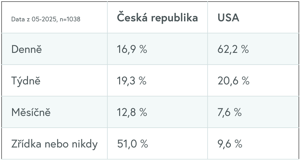 Jak vidíme z porovnávací tabulky, liší se hlavně mezní hodnoty denního používání a nepoužívání AI chatbotů. Je otázkou, jestli opravdu cca za rok bude podíl uživatelů v ČR denně využívajících AI chatboty stejně vysoký.