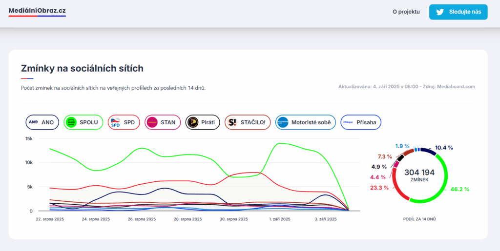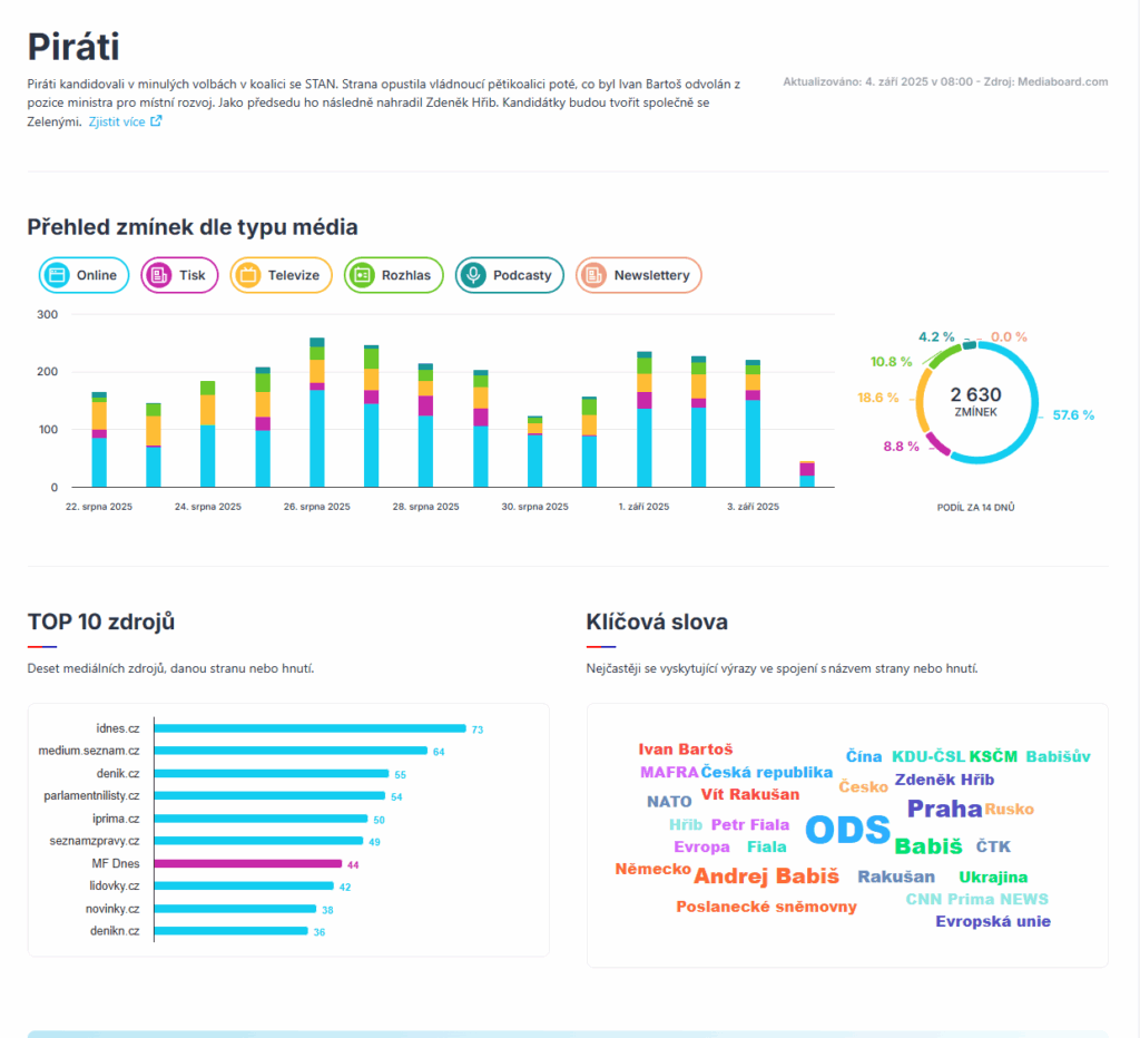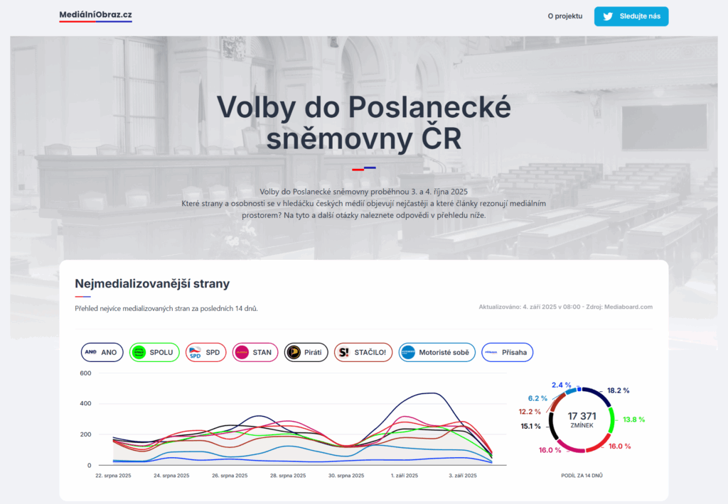 Počet mediálních výstupů, tonalita, zmínky na sociálních sítích i nejčastější klíčová slova pojící se s politickými subjekty. Nezávislý projekt Mediální obraz přináší v reálném čase přehled o mediální stopě politických stran a hnutí kandidujících do poslanecké sněmovny.
