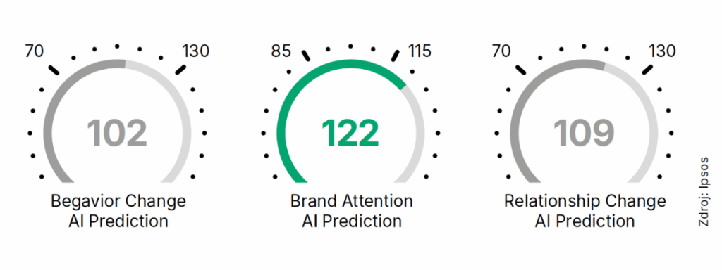 Kromě tvorby reklam může AI pomoci i v jejich vyhodnocování – rychle a cenově výhodně. Prostřednictvím Ipsos nástroje Creative Spark AI jsme například otestovali reklamu Levi’s využívající jako ambasadorku Beyoncé. Reklama, ve které si jde Beyoncé vyprat své „levisky“ do veřejné prádelny, ukazuje silný potenciál upoutat pozornost. Pomocí predikce pozornosti je navíc možné identifikovat klíčové scény a místa, jež diváky v průběhu reklamy nejvíce zaujmou. Schopnost reklamy ovlivnit výběr značky a dlouhodobý vztah k ní vykazuje reklama spíše průměrnou.