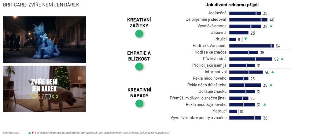 Že zvíře není jen dárek, ale především velká zodpovědnost do budoucích let, zdůrazňuje letošní vánoční reklama VAFO Group, výrobce krmiv Brit. Toto sdělení mezi českými diváky silně rezonuje. „Reklama Brit dosáhla nejlepšího výsledku ze všech historicky testovaných vánočních reklam v oblasti důvěryhodnosti a důležitosti sdělení. Ukazuje se, že v zemi milovníků zvířat, jakou Česká republika je, nám well-being našich mazlíčků není lhostejný a jde o důležité téma, které vyvolává silné emoce. Reklama Brit se proto řadí mezi vánoční Misfits – tak v Ipsosu říkáme úspěšným reklamám, kterým se podaří propojit emoce při sledování se silnou myšlenkou,“ říká Daniel Holátko, který v Ipsos vede divizi zaměřenou na testování komunikace.