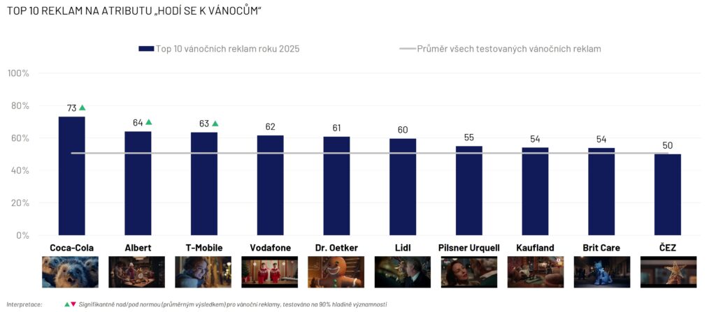 Hodnocení vybraných vánočních reklam proběhlo v prvním prosincovém týdnu roku 2025. Reklamy byly respondentům zobrazovány náhodně, každou reklamu hodnotilo 50 respondentů z reprezentativního vzorku populace ČR ve věku 18-65 let.