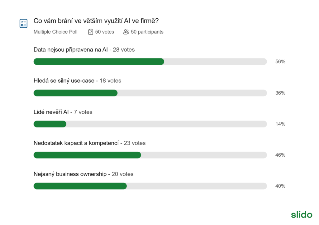 Podle 56 procent respondentů je hlavním limitem to, že jejich data nejsou v takovém stavu, aby mohly vznikat spolehlivé AI služby. Druhou nejčastěji uváděnou překážkou je nedostatek interních kapacit a kompetencí (46 procent). Firmy zároveň často řeší nejasné „vlastnictví“ AI témat v byznysu (40 procent) a potřebu najít skutečně silný use-case (36 procent). Nedůvěra lidí v AI jako bariéra se objevuje pouze u 14 procent odpovědí.