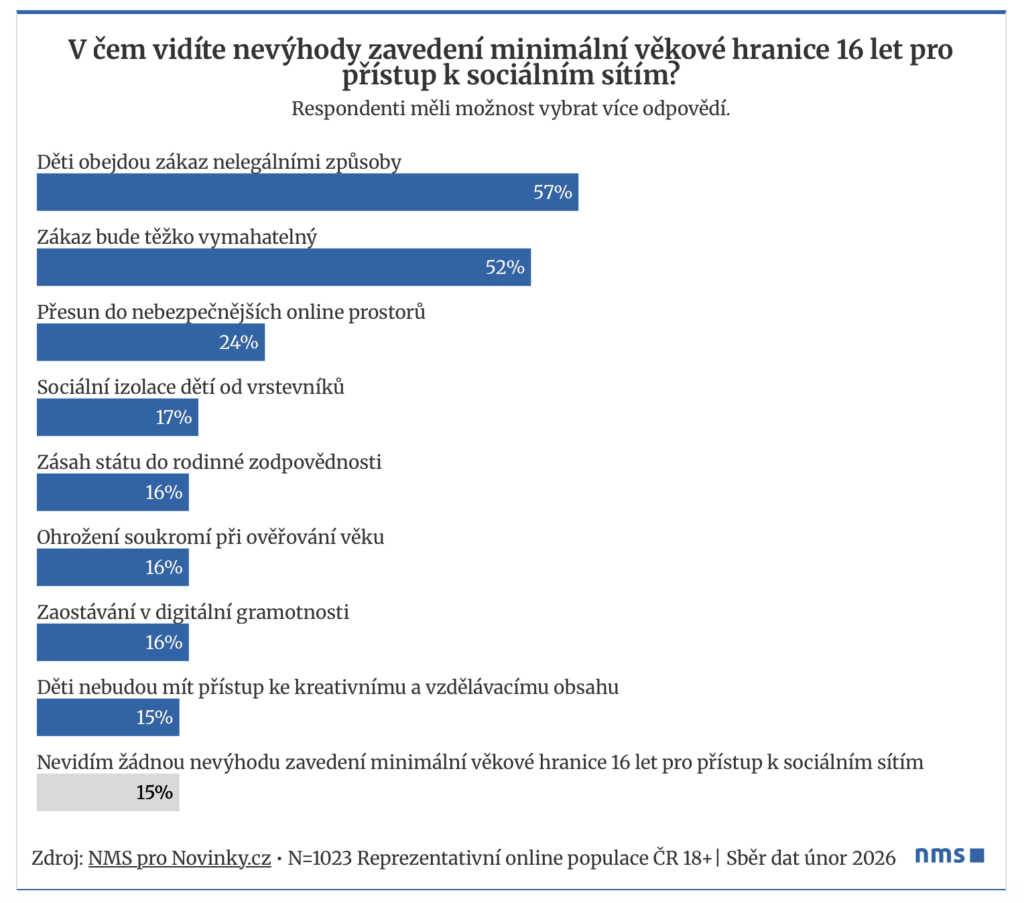 Zavedení věkové hranice ale podle Čechů přináší i řadu rizik. Nejčastěji zmiňovaným problémem je nevymahatelnost zákazu (52 procent) a jeho snadné obcházení (57 procent). Čtvrtina respondentů (24 procent) se obává, že by se děti mohly přesunout do ještě nebezpečnějších online prostředí mimo hlavní sociální sítě. Stejné obavy se objevují i na Slovensku.