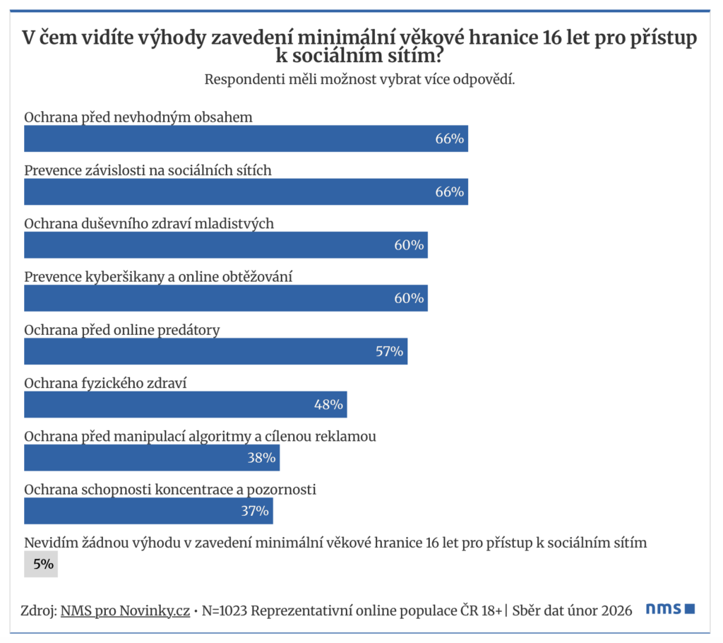 Češi vnímají věkové omezení především jako nástroj ochrany dětí. Dvě třetiny respondentů (66 procent) se domnívají, že hranice 16 let by děti chránila před nevhodným obsahem. Stejné procento lidí zároveň považuje omezení za důležitou prevenci závislosti na sociálních sítích.