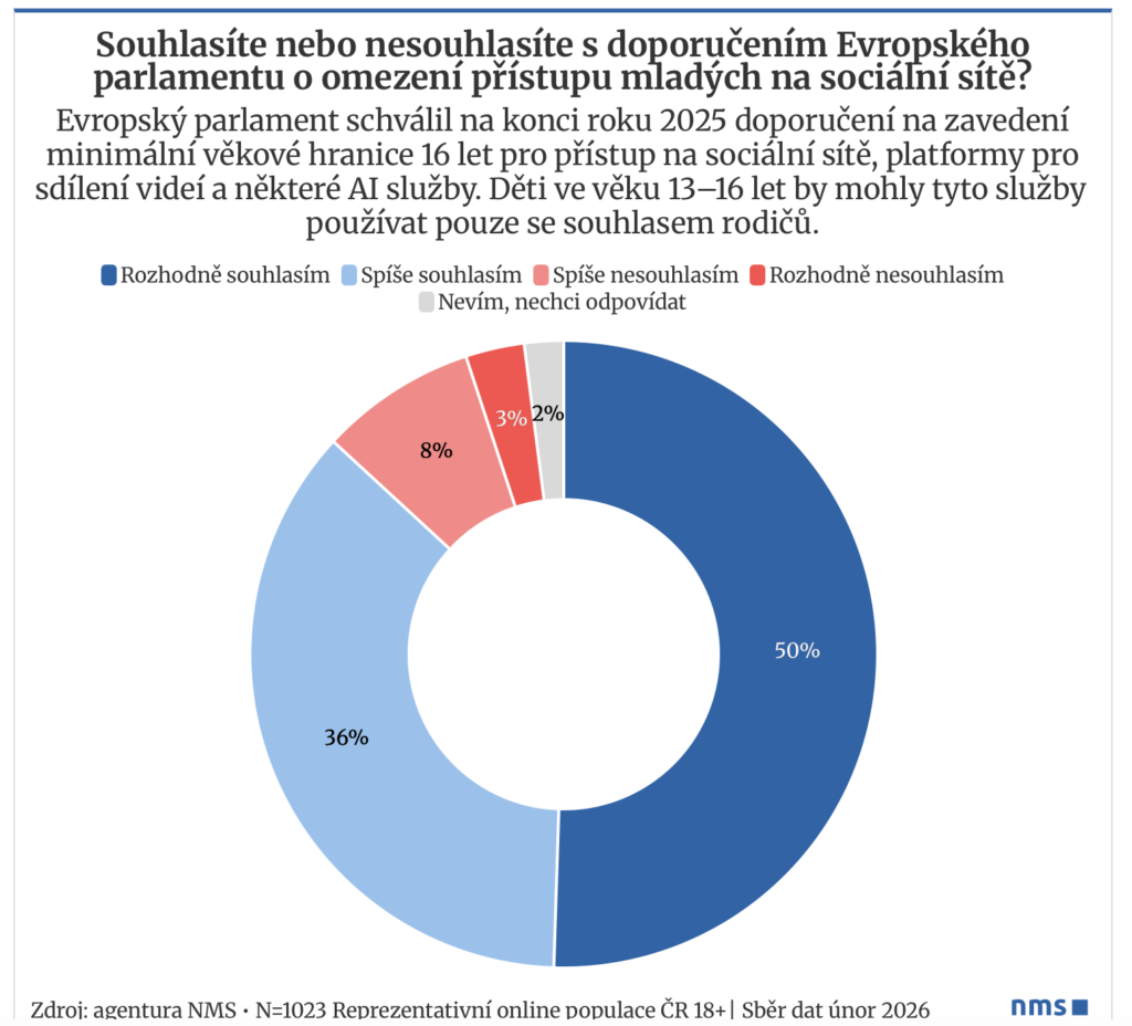 „Podle mezinárodní studie The Health Behaviour in School-aged Children (HBSC) z roku 2022 spadá 8 procent mladých lidí ve věku 11 až 15 let do rizikové kategorie využívání sociálních sítí. Oproti roku 2018 se tento podíl zvýšil o tři procentní body. Češi proto nechtějí své děti chránit pouze před kyberšikanou nebo online predátory, ale dvě třetiny z nich vidí přínos věkové hranice právě v prevenci závislosti a ochraně duševního zdraví,“ doplňuje Lucie Režná z NMS.