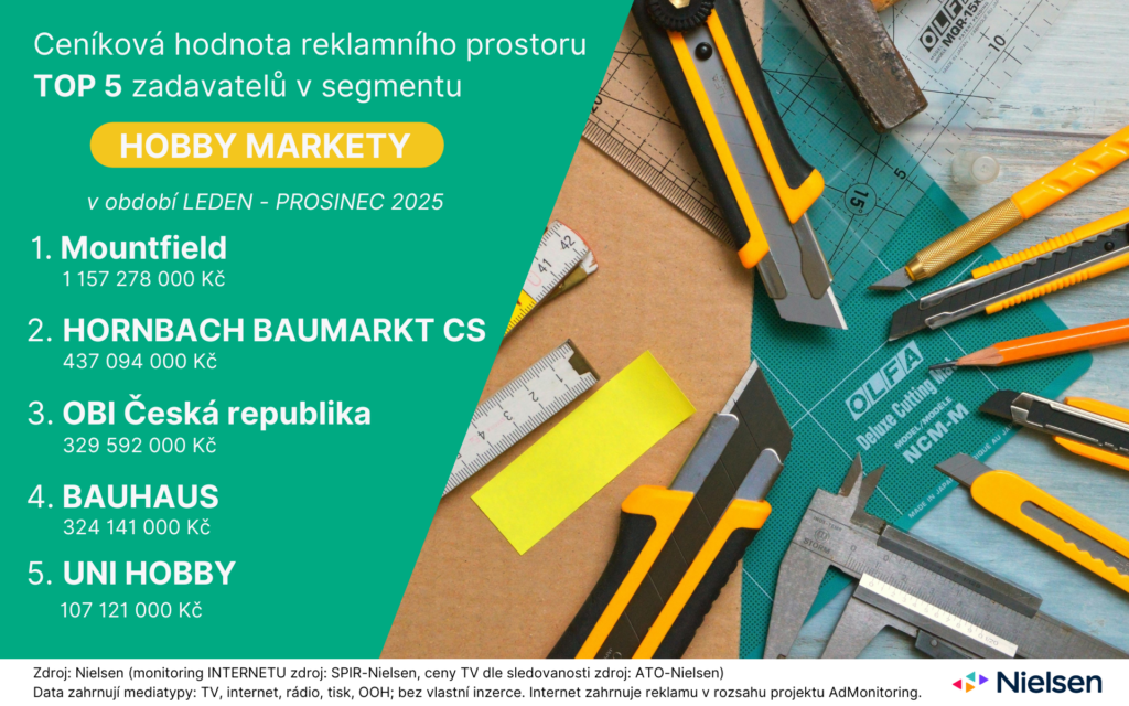 Doplnění poskytují data z monitoringu reklamy Ad Intel společnosti Nielsen zaměřená na kategorii hobby marketů za rok 2025. Nejsilnější inzerci měl podle něj zadavatel Mountfield.