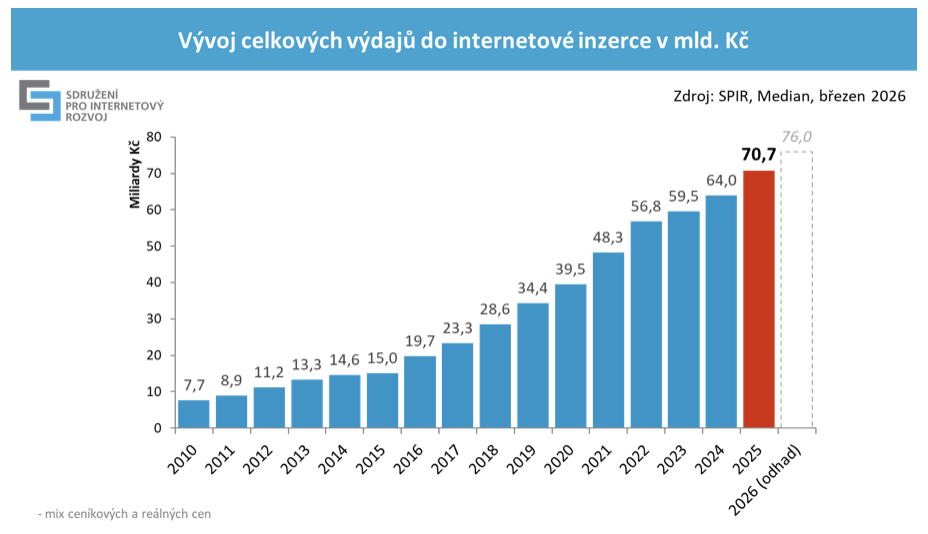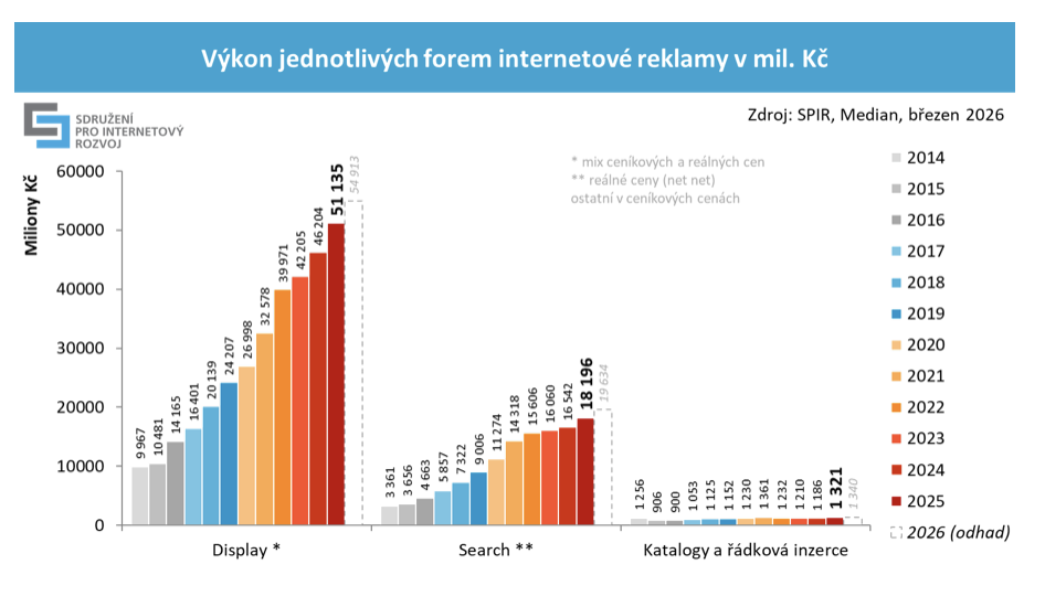Online reklama v roce 2025 dosáhla téměř 71 miliard korun, což představuje meziroční nárůst o 10,6 procent. Rostly všechny formy online reklamy – display reklama (+10,7 procent), reklama ve vyhledávání (+10 procent) i katalogy a řádková inzerce (+11,4 procent). Odhad růstu pro rok 2026 je 7,4 procent. Vyplývá to výzkumu inzertních výkonů internetové reklamy, který pro Sdružení pro internetový rozvoj (SPIR) realizuje agentura Median.