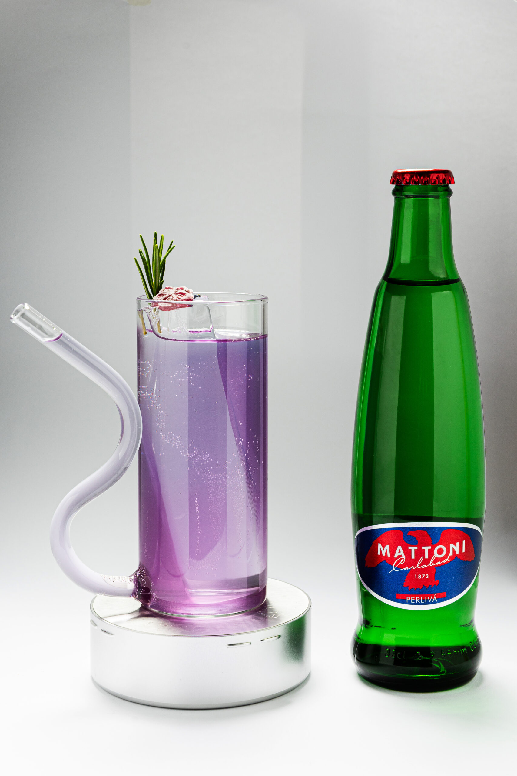 Mattoni Violet Forest se servíruje v unikátní sklenici vytvořené na míru firmou DT Glass, s čirým ledem, bonbonem z fialek a snítkou rozmarýnu. Design sklenice moderním způsobem odkazuje na historické karlovarské lázeňské pohárky, z nichž se tradičně popíjejí minerální vody – symbolické propojení současné gastronomie s tradicí značky Mattoni.