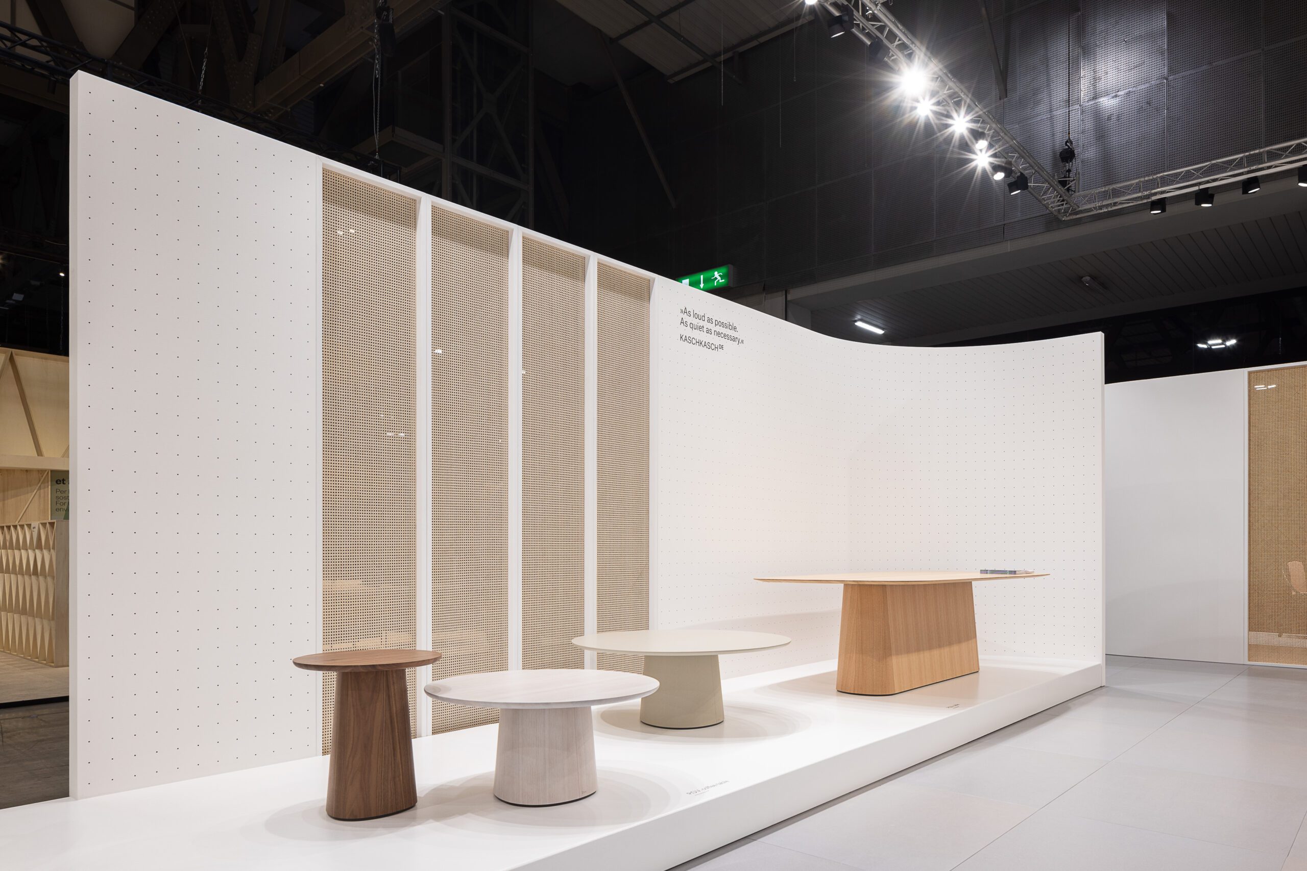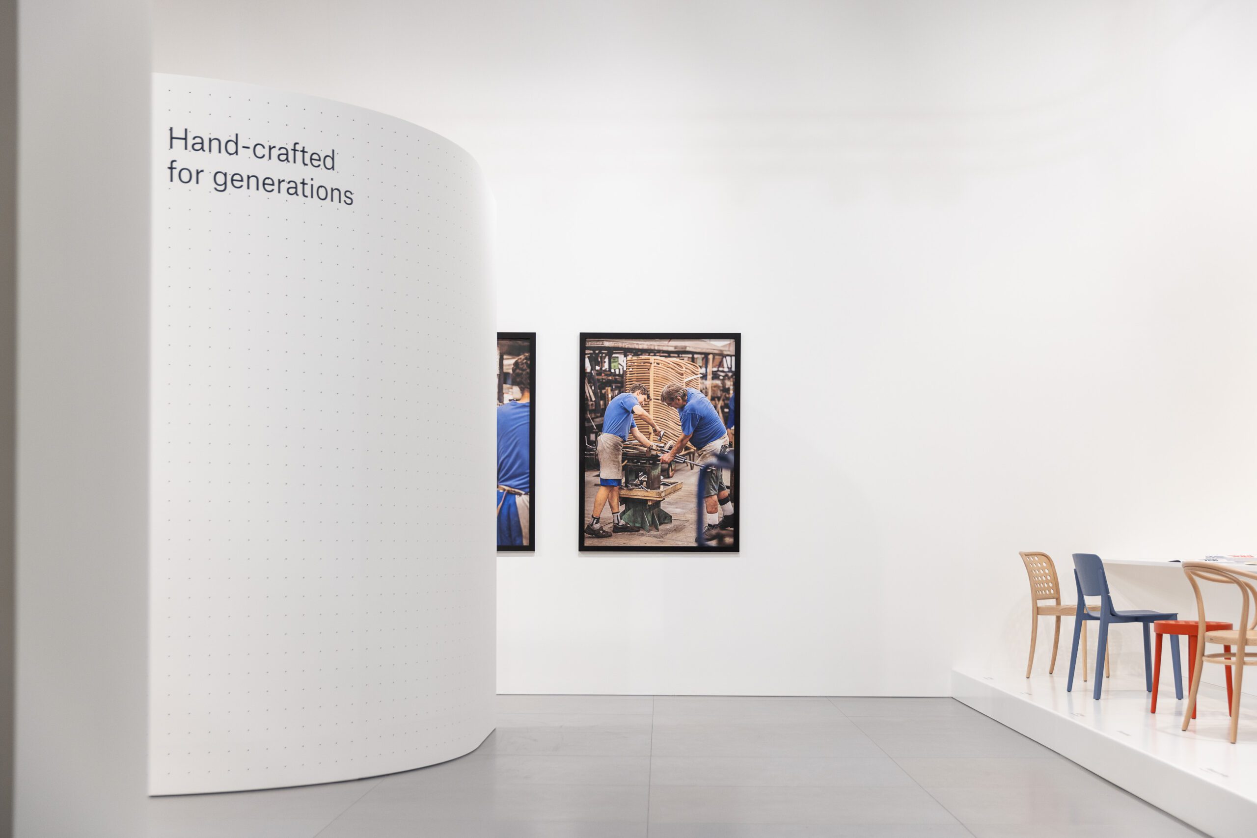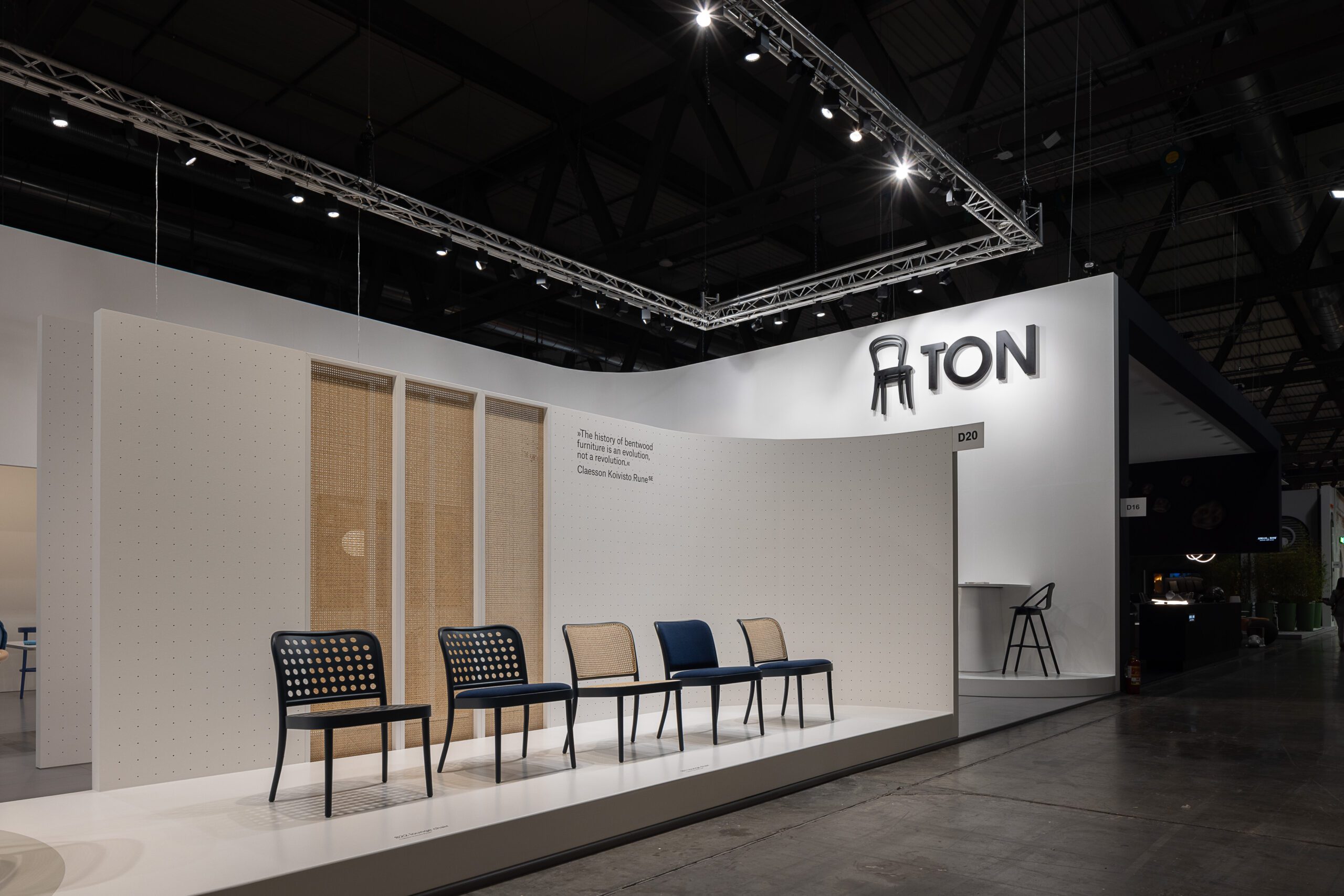 Mimochodem, s udržitelností pracovala v expozici i značka Ton — stavěla na dřevěných a vyplétaných modulech odkazujících na tradiční materiály brandu a oblé stěny představující typickou technologii ohýbání dřeva. „Protože je výstavní systém složen právě z modulů, lze jej rozebrat a používat opakovaně. Stejně jako u produktů nám záleží na tom, abychom dosáhli dlouhého životního cyklu a neplýtvali zdroji,“ uvádí Anna Handlová z Tonu, pro niž koncept stánku navrhlo německé studio KaschKasch a grafický koncept vídeňské Bueronardin.