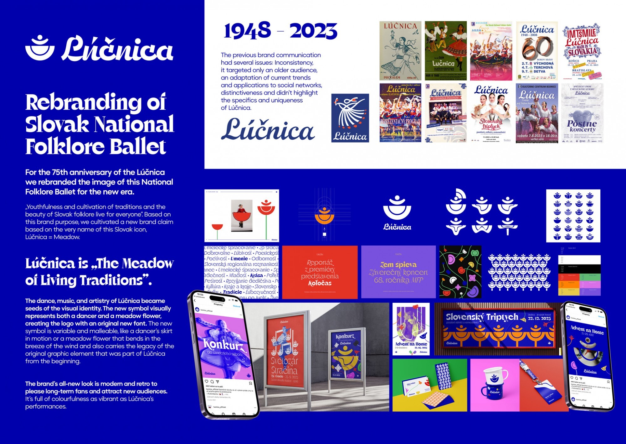 Taktéž dvakrát je ve finále rebranding souboru Lúčnica od agentury Made by Vaculik, který z uměleckého folklorního tanečního souboru udělal „Louku žijících tradic“.