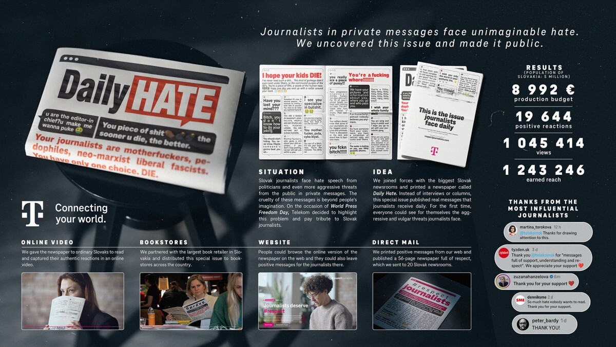 Rovněž dva shortlisty má kampaň „Daily Hate“ (Zprávy, které nikdo nechce číst) od MUW Saatchi & Saatchi pro Telekom. Projekt vydání speciálních novin s nenávistnými zprávami, jimž musejí denně čelit slovenští novináři, už má mimo jiné čtyři stříbra ze soutěže Golden Drum.