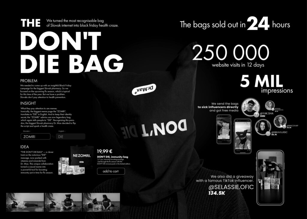 Nominaci pak má i projekt „tašky Nezomri“ pro lékárenský řetězec Dr.Max. V návaznosti na velmi populární „meme skupinu“ Zomri vytvořil tašku s opačným sdělením plnou vitamínů pro chřipkovou sezonu.
