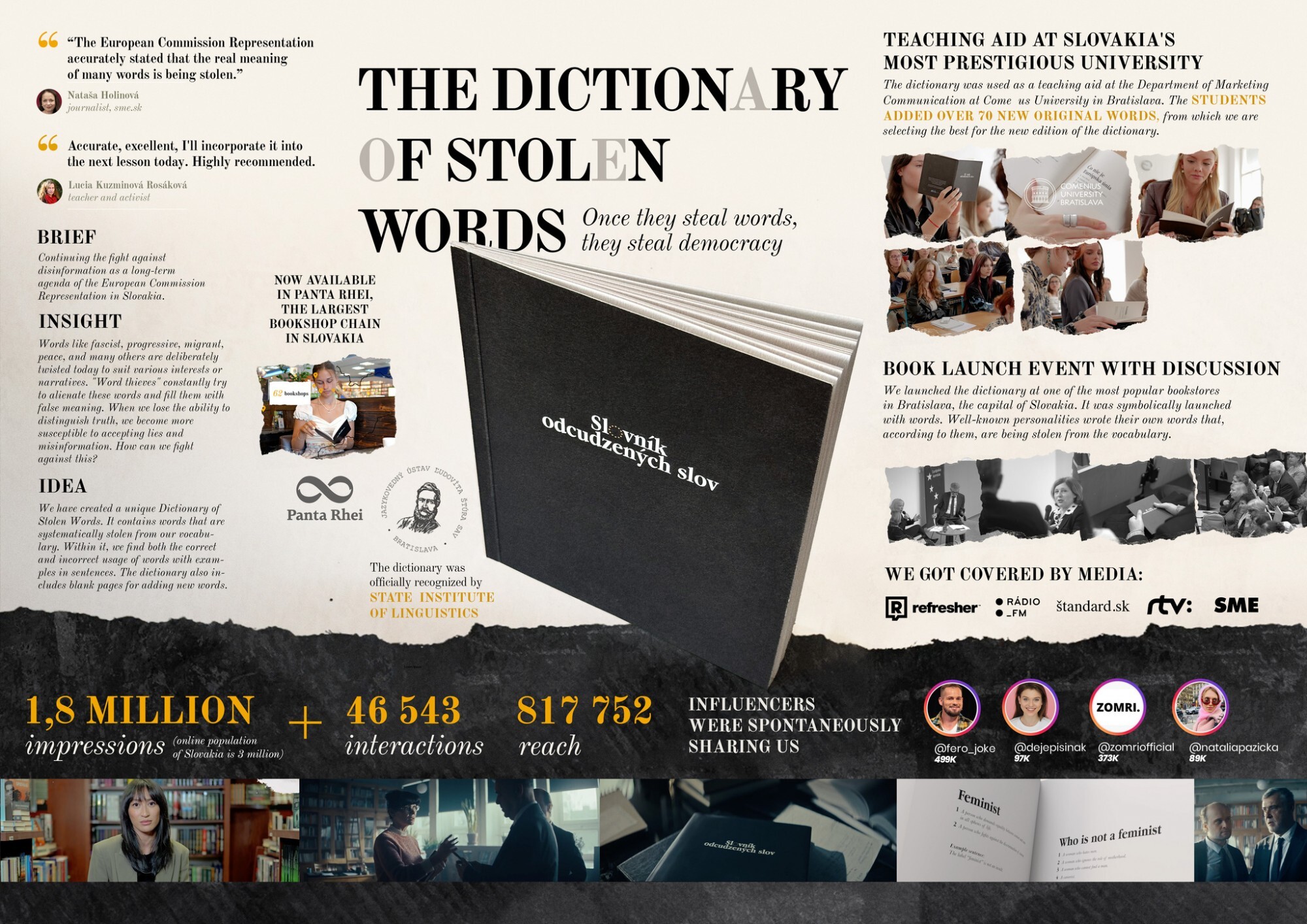 Na shortlistu je též kampaň „Slovník odcizených slov“ pro Zastoupení Evropské komise na Slovensku – bojovala s dezinformací pomocí slovníku, v němž upozorňovala na pravý význam slov, které dezinformátoři a konspirátoři v posledních letech notně překrucují.