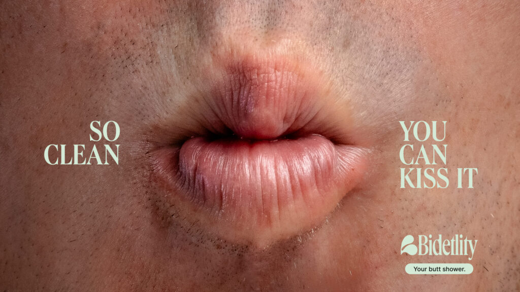 Co vám připomínají rty našpulené k polibku? Přesně s tím dvojsmyslem si hraje kampaň „So clean you can kiss it“ od agentury Joan Berlin pro brand Bidetlity a jeho přenosné bidety.