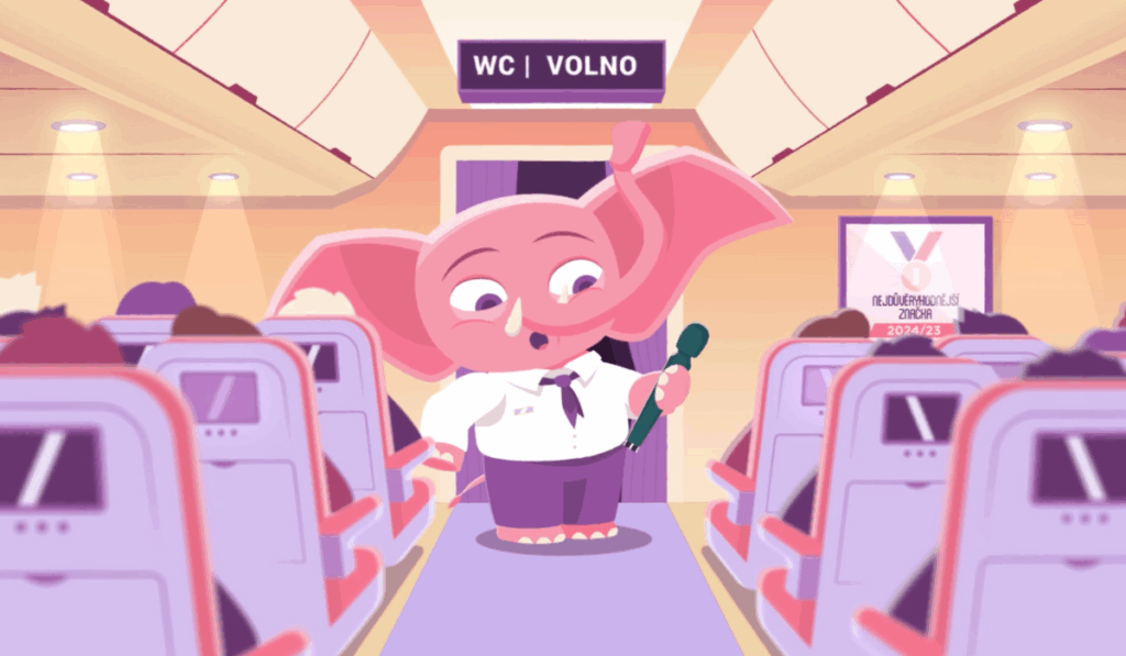 Ústřední postavou spotu je opět maskot Růžového slona, kterému propůjčil hlas herec Martin Stránský (ve slovenské verzi Michal Hudák). Tentokrát slon v roli stevarda podává hlášení cestujícím na palubě letadla a upozorňuje, aby věnovali pozornost bezpečnostním pokynům.