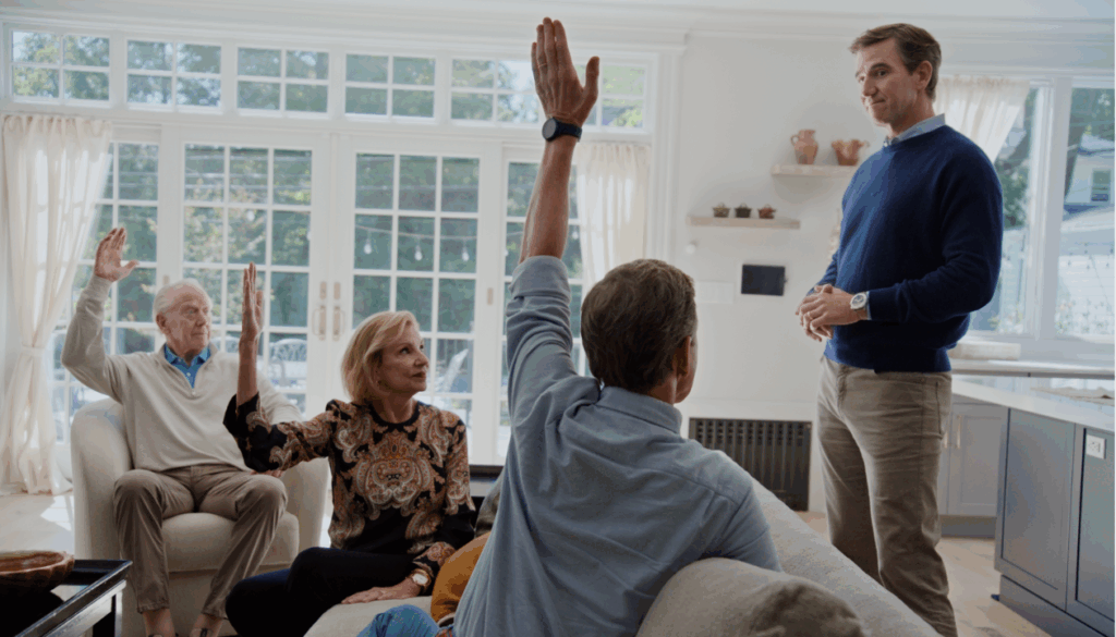 „Eli byl vždy vyrovnaný,“ říká ve videu Archie Manning. „Ale vybrat, kdo bude mít rodinné předplatné? To je úplně nová výzva. Ale nakonec, pokud chce mluvit o fotbale a The Athletic, ví, že potřebuje v plánu svého otce,“ dodává.