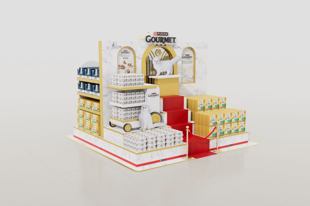 Zájem odborné poroty vzbudil i shop‑in‑shop navržený pro značku Purina, který letos získal další první cenu. V jeho případě porota ocenila především koncepci vystavení, kdy je kočka umístěná na „pódiu“ se schody s červeným kobercem.