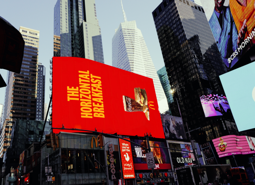 Zatímco byl nespočet Američanů v pondělí ráno po finále Super Bowlu právě ve zmiňované horizontální poloze, McDonald’s otočil svou komunikaci tak, aby stavu fanoušků odpovídala. „Billboardy, televizní spot i naše sociální sítě jsou horizontálně otočené – protože právě v takové pozici se mnoho našich fanoušků bude nacházet při zotavování po velkém zápase. Snídaně z McDonald’s, konkrétně hot honey sausage + egg biscuit, je tím, co vám pomůže se zase postavit na nohy (nebo alespoň dostatečným důvodem na chvíli vstát),“ píše společnost v tiskové zprávě a dodává, že jediné, co fanoušci musí udělat, je zvednout prst a stisknout tlačítko „objednat“ v aplikaci.