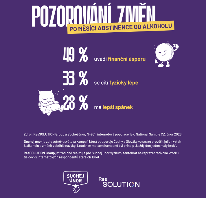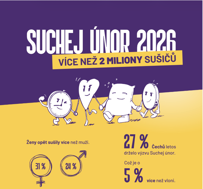 Nejen revizí vlastního vztahu k alkoholu, ale také bližším pohledem na to, jak alkohol a jiné závislosti ovlivňují náš čas, vztahy, spánek i finance, oslovil letošní ročník kampaně Suchej únor rekordní počet účastníků. Zapojilo se do něj 2 035 000 Čechů, tedy 27 procent populace starší 18 let. Nejviditelnější změnou, kterou při tom pozorovali, je finanční úspora.
