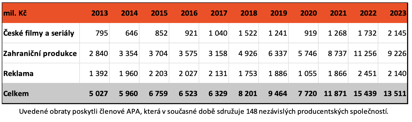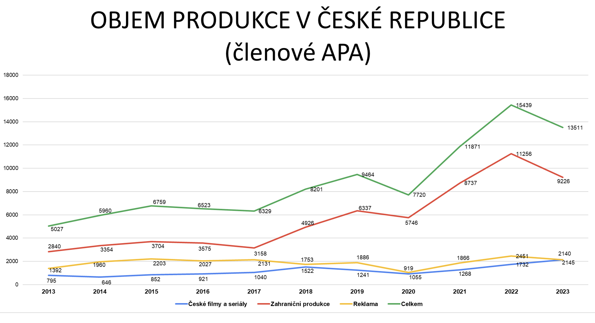 Česká audiovize je podle Asociace producentů v audiovizi (APA) stabilizovaná, v roce 2023 dosáhla obratu 13,5 miliardy, což je oproti rekordnímu roku 2022 pokles o 12 procent. Hlavním důvodem je propad zahraniční produkce. Původní česká tvorba vzrostla na rekordních 2,1 miliardy korun, 60 procent tvoří produkce pro TV a VOD. Ani to ale nestačilo na dorovnání nižšího obratu zahraničních zakázek, jejichž obrat v roce 2023 činil 9,2 miliardy, meziročně o 18 procent méně. Jde o důsledek celoročně pozastaveného přijímání pobídkových registrací z důvodu přetížení systému. Vedle toho byla stávka scenáristů a herců v USA, která vedla k zastavení řady filmových i televizních projektů.