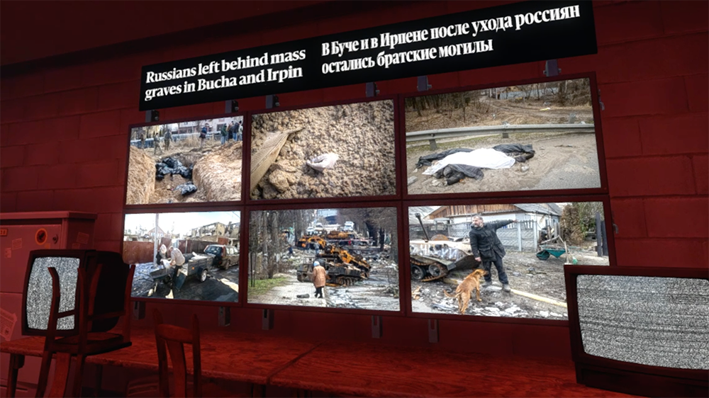 Co v ní najde? Například mapu zobrazující všechny civilní ukrajinské objekty, které byly Rusy zasaženy. Na další stěně jsou informace o masakru v Buče – když se k nim přiblíží, ruský hlas popíše, jak došlo k vraždění ukrajinských civilistů ruskými vojáky.