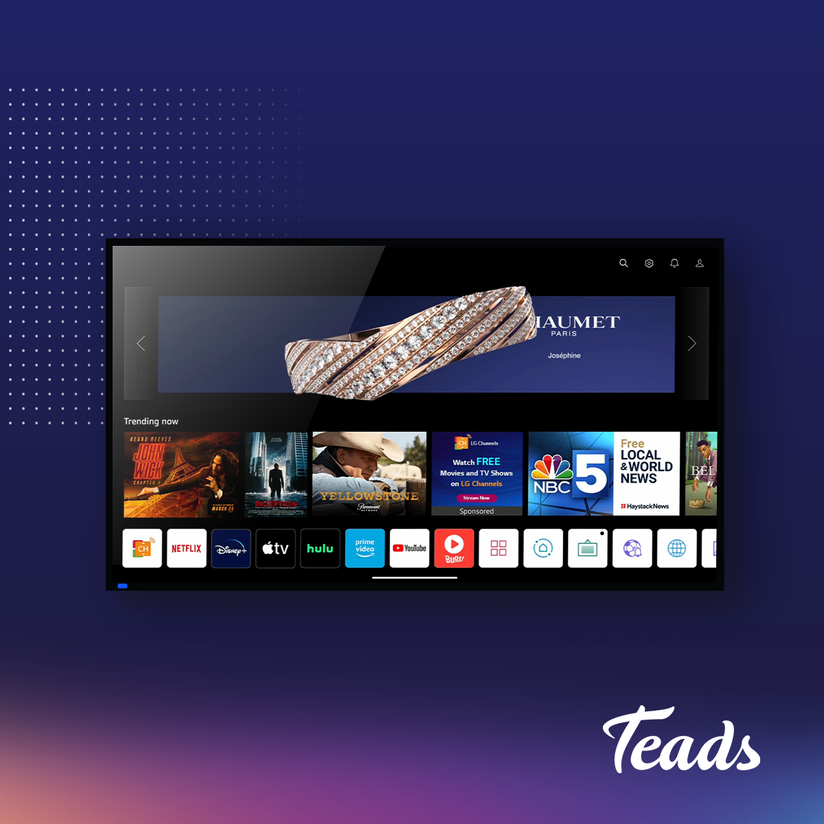 Pro výrobce chytrých televizorů (OEM) se jedná o lukrativní příležitost k monetizaci reklamního prostoru. Reklamní obsah je umístěn výhradně na domovských obrazovkách chytrých televizorů, což zajišťuje viditelnost a zapojení uživatelů přímo v jejich obývacím pokoji. Reklamní sdělení se objevuje formou výrazného banneru, který upoutá pozornost publika, aniž by narušoval uživatelský zážitek ze sledování televize, ať už diváci používají služby podporované reklamou, nebo ne. Globální mediální platforma Teads dokáže přenést výjimečnou reklamní kreativu na obrazovky chytrých televizorů, včetně 3D nativních reklam (viz ukázka CTV kampaně pro Chaumet).
