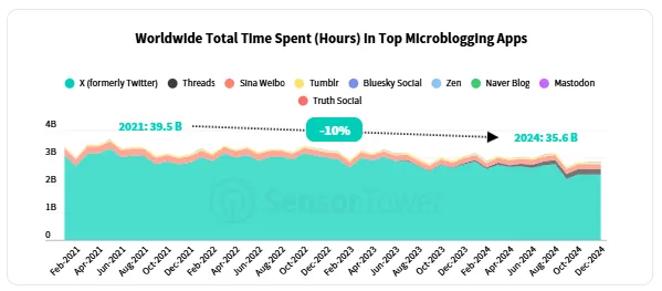 „I když X zůstává jasným lídrem z hlediska času stráveného na platformě, celkový čas strávený na deseti největších aplikacích globálně klesl mezi lety 2021 a 2024 o 10 procent. Někteří uživatelé X přešli k alternativám, jiní si však našli jiné zdroje zábavy, jako jsou krátká videa nebo streamovací služby,“ uvádí se v přehledu.