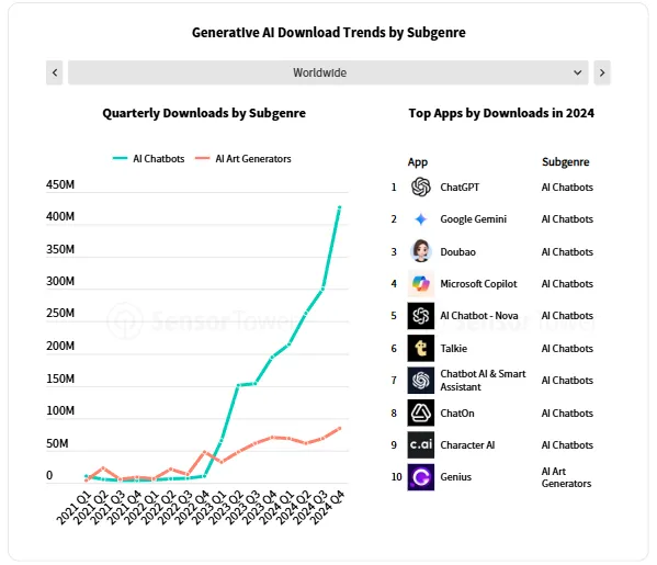 Vzestup AI aplikací je dalším zajímavým tématem, které je doplněno výraznými grafy a daty, jež ukazují jejich rychle rostoucí popularitu.