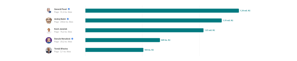 Celkově od 2. října do konce roku 2022 nejvíce utrácel profil Petra Pavla, v těsném závěsu byl profil Andreje Babiše. Velký náskok měl dlouhou dobu Karel Janeček, který ale po přepočítání hlasů nakonec nepatří mezi platné kandidáty (s útratou 1,03 mil. Kč). Až na čtvrtém místě je Danuše Nerudová, která oproti lídrovi zaostává v celkové útratě o více než polovinu. Pomyslnou top 5 uzavírá Tomáš Březina s útratou nad půl milion korun.