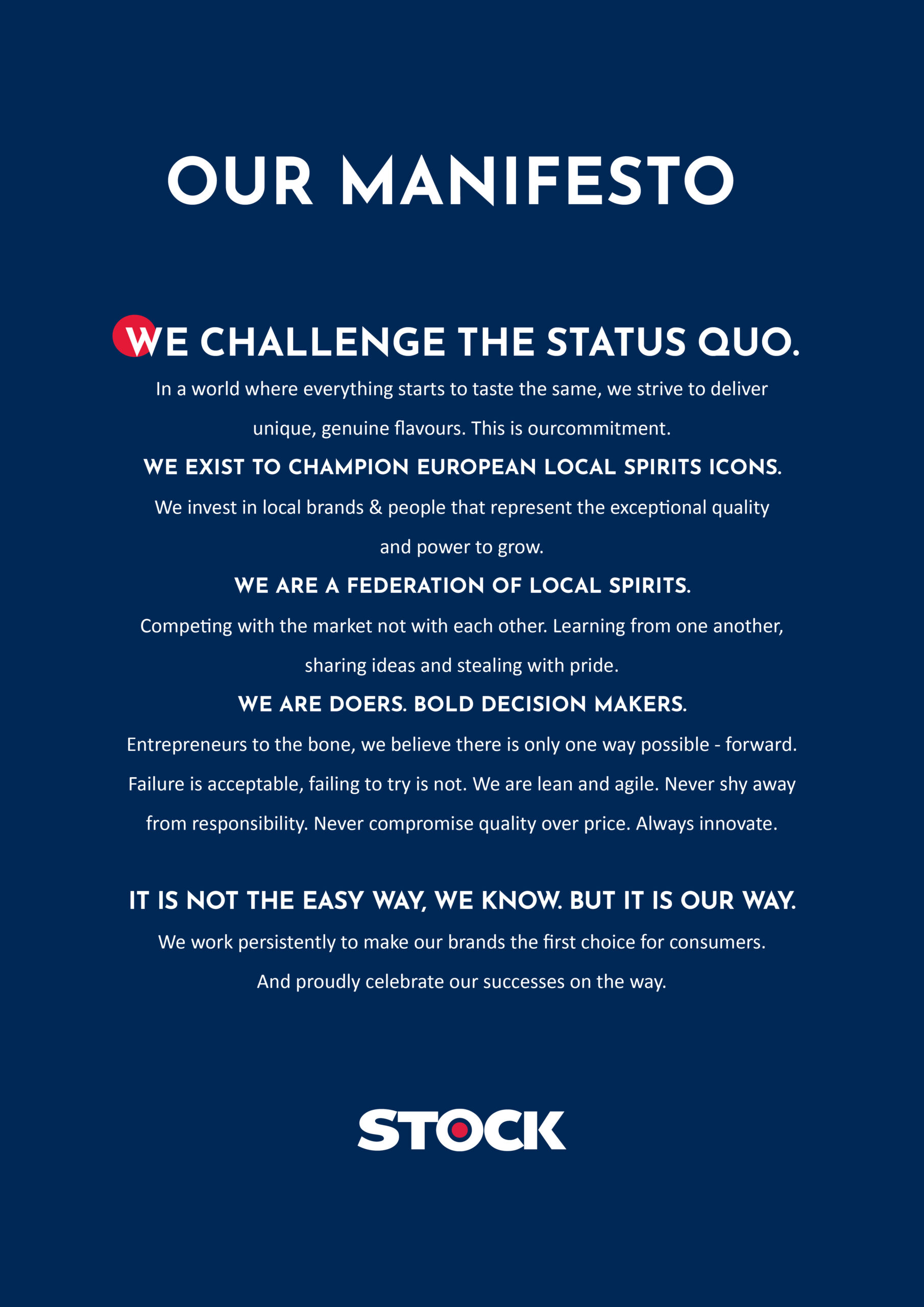 Třetím prvkem nové identity společnosti Stock Spirits je Manifest, který informuje partnery a zaměstnance o hodnotách, aspiracích a záměrech společnosti. Byl vytvořen ve spolupráci se zaměstnanci firmy napříč trhy.