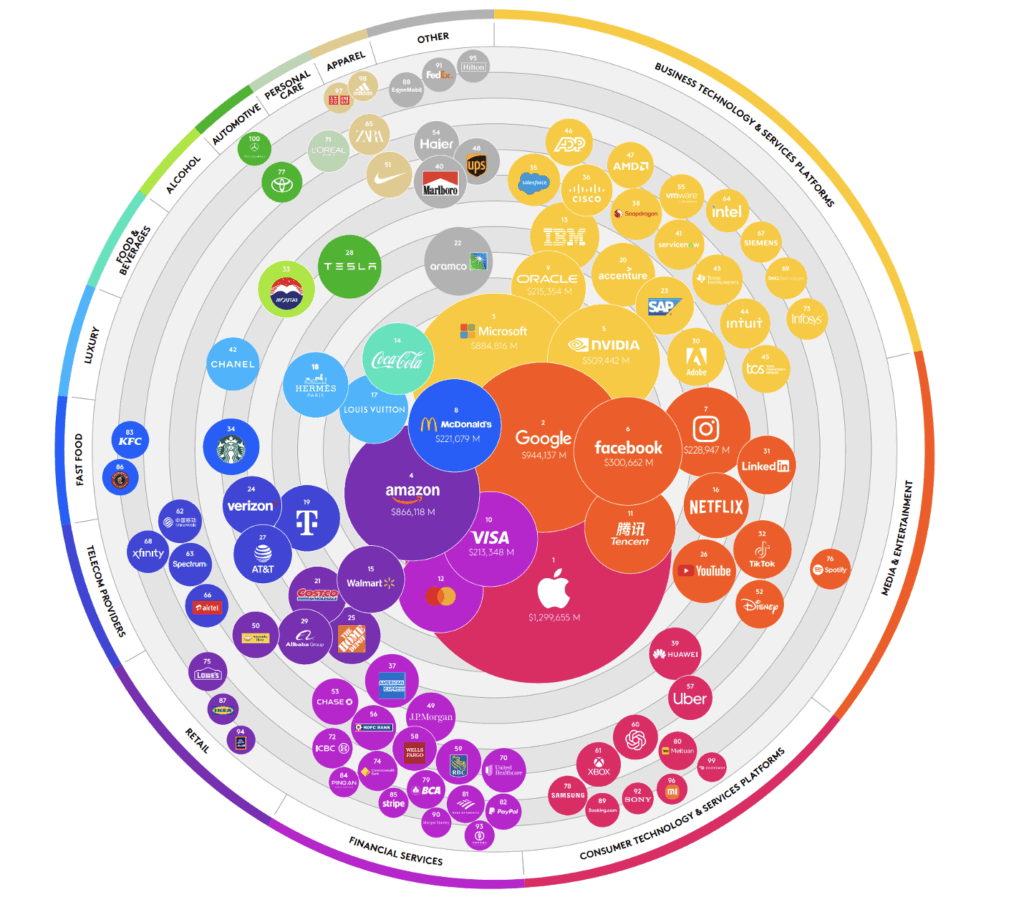 Stovka největších globálních brandů má celkovou hodnotu 10,7 bilionu dolarů, meziročně narostla o 29 procent. Víc než 12 procent z celkové hodnoty připadá na společnost Apple, která se v čele žebříčku drží už čtvrtým rokem a pořád je jedinou značkou převyšující hodnotu jednoho bilionu dolarů.