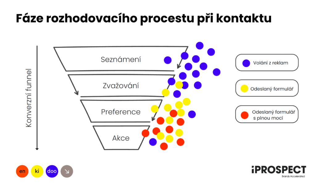 V týmu datových specialistů iProspectu začala vznikat hypotéza, že různé druhy kontaktů (odeslaný formulář, odeslaný formulář s plnou mocí, volání z reklam) přinášejí rozdílný dopad na konečný počet uzavřených smluv. „Hypotéza o odlišném dopadu kontaktů stála na myšlence, že různí uživatelé se nacházejí při kontaktu v různých částech rozhodovacího procesu (seznámení, zvažování, preference, akce). Bylo tedy nutné klasifikovat kontakty podle těchto fází a přiřadit jim obchodní hodnotu,“ říká Barbora Matíková, Senior Programmatic Consultant, iProspect.