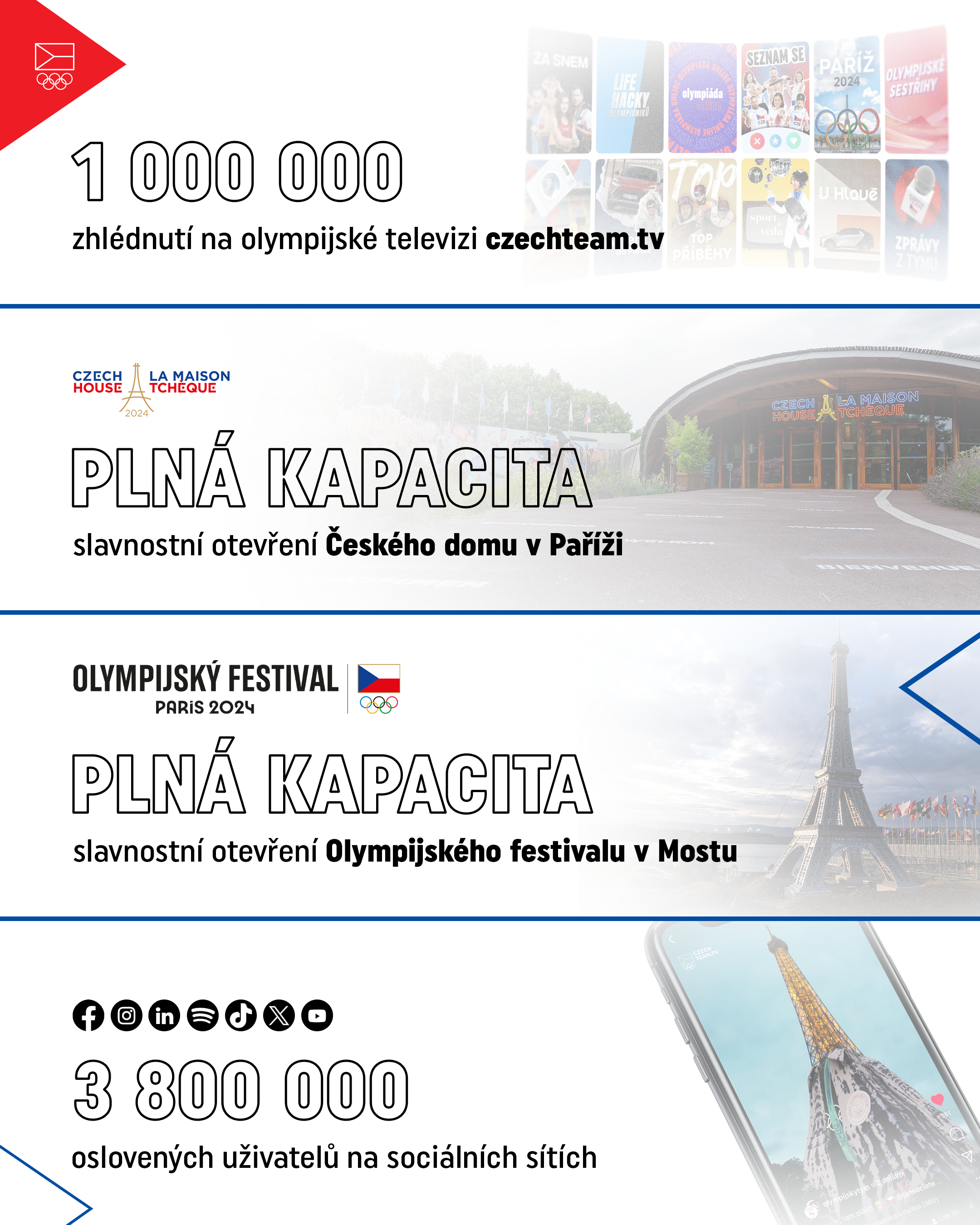 „V tvůrčím týmu přímo v Českém domě v Paříži máme 20 specialistů, mezi nimi i motion grafika a CGI experta. Většinu obsahu tvoří videa pro sociální sítě i internetovou televizi czechteam.tv. Ta překonala už před hrami 1 milion zhlédnutí,“ doplňuje Václav Blahout zodpovědný za digitální distribuci obsahu při OH v Paříži.